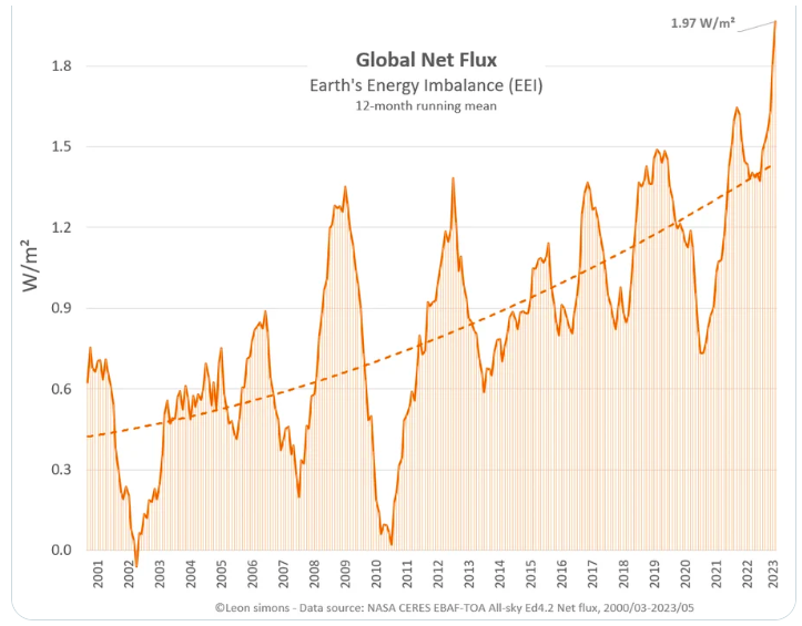 The diagram was prepared by Leon Simons, who tweeted the diagram on July 28, 2023, see https://twitter.com/LeonSimons8/status/1684966795826929666. The diagram uses NASA CERES EBAF-TOA All-sky Ed4.2 Net Flux data from March 2000 to May 2023.