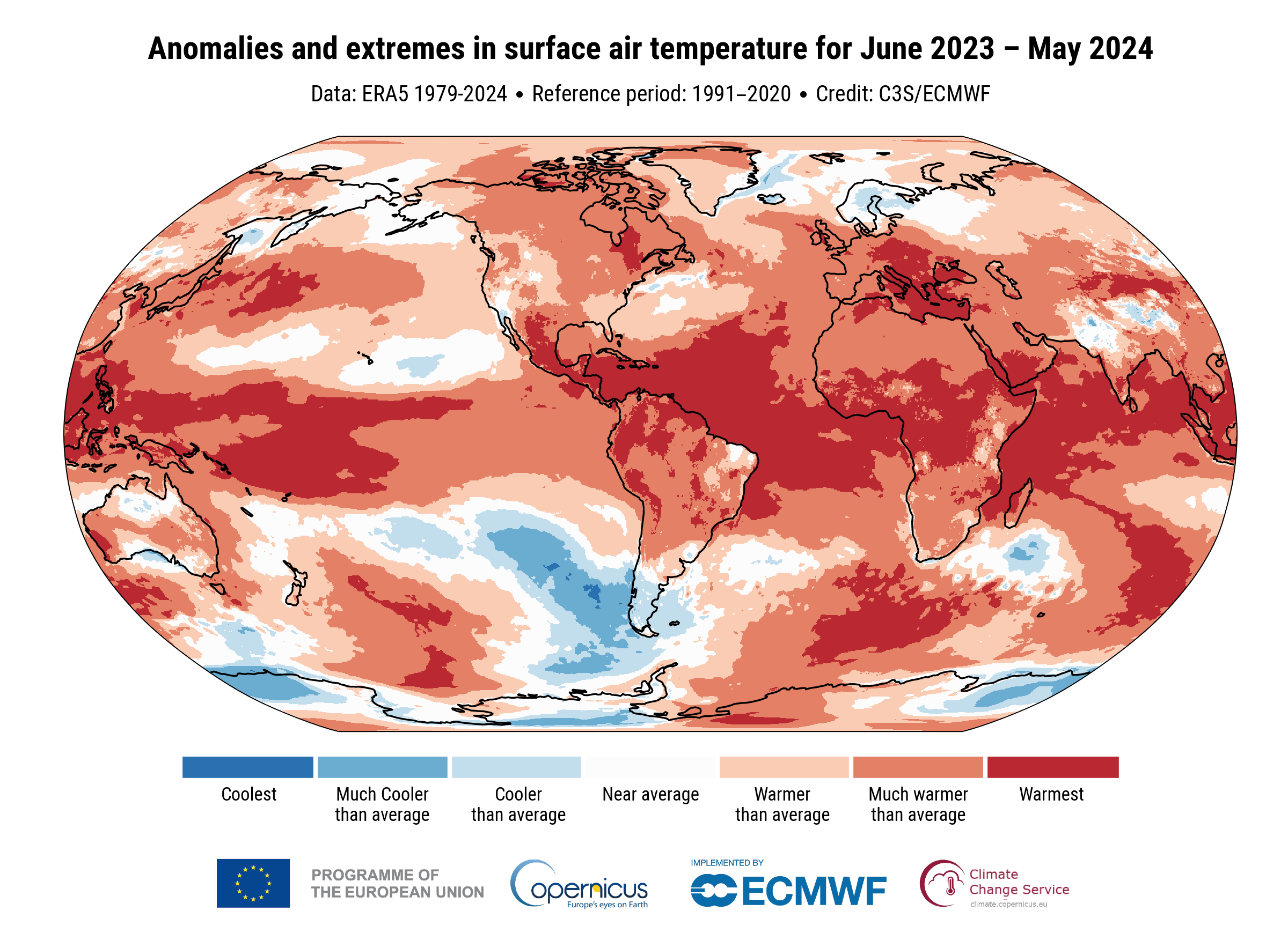 Anomalies and extremes in surface air temperature for the 12-month period from June 2023 to May 2024. Colour categories refer to the percentiles of the temperature distributions for the 1991–2020 reference period. The extreme (“Coolest” and “Warmest”) categories are based on rankings for the period 1979–2024. Percentiles and rankings are relative to all 12-month averages between January 1979 and May 2024. Data source: ERA5. Credit: Copernicus Climate Change Service/ECMWF.