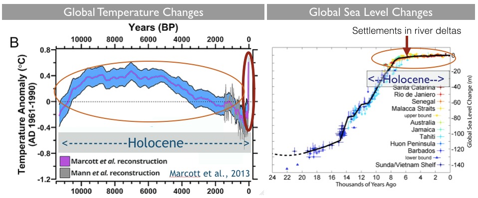 Figure 2: Base Line for the normal ranges of climate-related variables during the last 800,000 years and during the Holocene (dark blue boxes). Read more about normal ranges ... The stability of the climate in the Holocene is exceptional, and this stability was extremely favorable for humanity. In fact, it created a safe operating space for humanity (Rockstrom et al., 2009). The stable climate supported humanity's transition to agriculture. When sea level becames stable, humans could for the first time develop permanent settlements in large river deltas and benefit from the logistic advanatges and the rich ecosystem services these areas offered. When global sea level was changing at rate of meters per century, it was not possible to settle in these beneficial areas because of the flat topography, coast lines where moving horizontally often 50 to 100 km in a century.