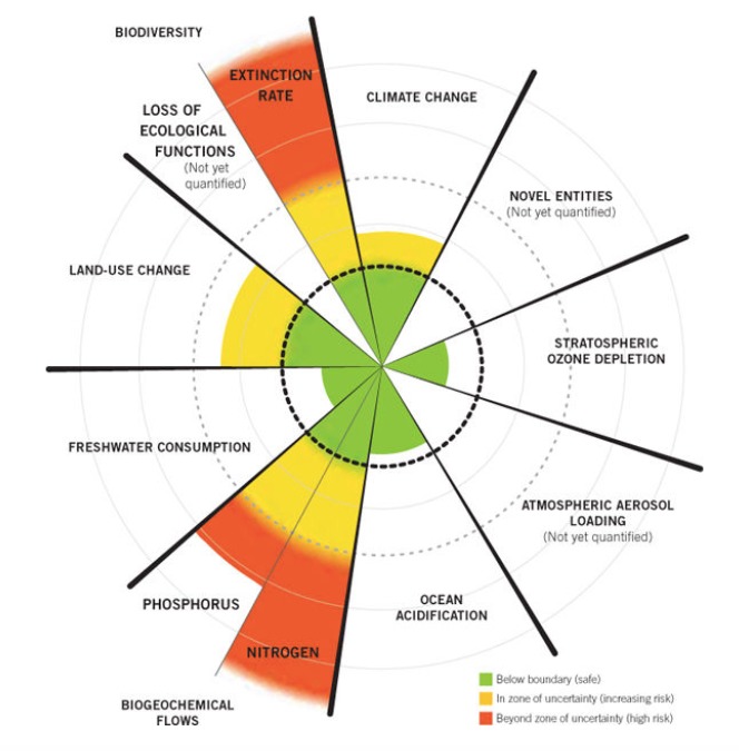 Syndrome of Modern Global ChangeThe syndrome of modern global change is a direct result of humanity's activities over recent centuries that have significantly change the physiology of the planetary life-support system. As discussed under the baseline, the Holocene was a period of exceptional stability of the climate. It also was a period of stability for many other variables that characterize the planetary physiology, including the flows in the carbon cycle, the water cycle, and the cycles of nutrients such as nitrogen and phosporous. Likewise, changes in the land cover and, conesequently, albedo were very small compared to pre-Holocene times. With this stability, the Holocene provide a safe operating space for humanity (Rockström et al., 2009). The Holocene can be characterized by boundaries in many of these variables. Rockström et al. (2009) identified nine global boundaries for this safe operating space, and they were able to quantify seven of them (Figure 1). Unfortuantely, two of those boundaries have already been crossed and several others are likely to be crossed in the near future. ![]() Figure 1: Global boundaries of the safe operating space for humanity. From Rockström and Klum (2015). The ReferencesRockström, J., Klum, M, 2015. Small Planet, Big World. Yale University Press. Rockström, J., Steffen, W., Noone, K., Persson, Å., Chapin, F. S. III, Lambin, E., Lenton, T. M., Scheffer, M., Folke, C., Schellnhuber, H., Nykvist, B., De Wit, C. A., Hughes, T., van der Leeuw, S., Rodhe, H., Sörlin, S., Snyder, P. K., Costanza, R., Svedin, U., Falkenmark, M., Karlberg, L., Corell, R. W., Fabry, V. J., Hansen, J., Walker, B., Liverman, D., Richardson, K., Crutzen, P., Foley, J., 2009. A safe operating space for humanity, Nature, 461, 472-475. Your Comments and QuestionsPlease, send us comments you might have on the syndrome of modern global change. Let us know if you have any questions. |