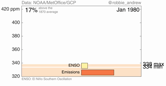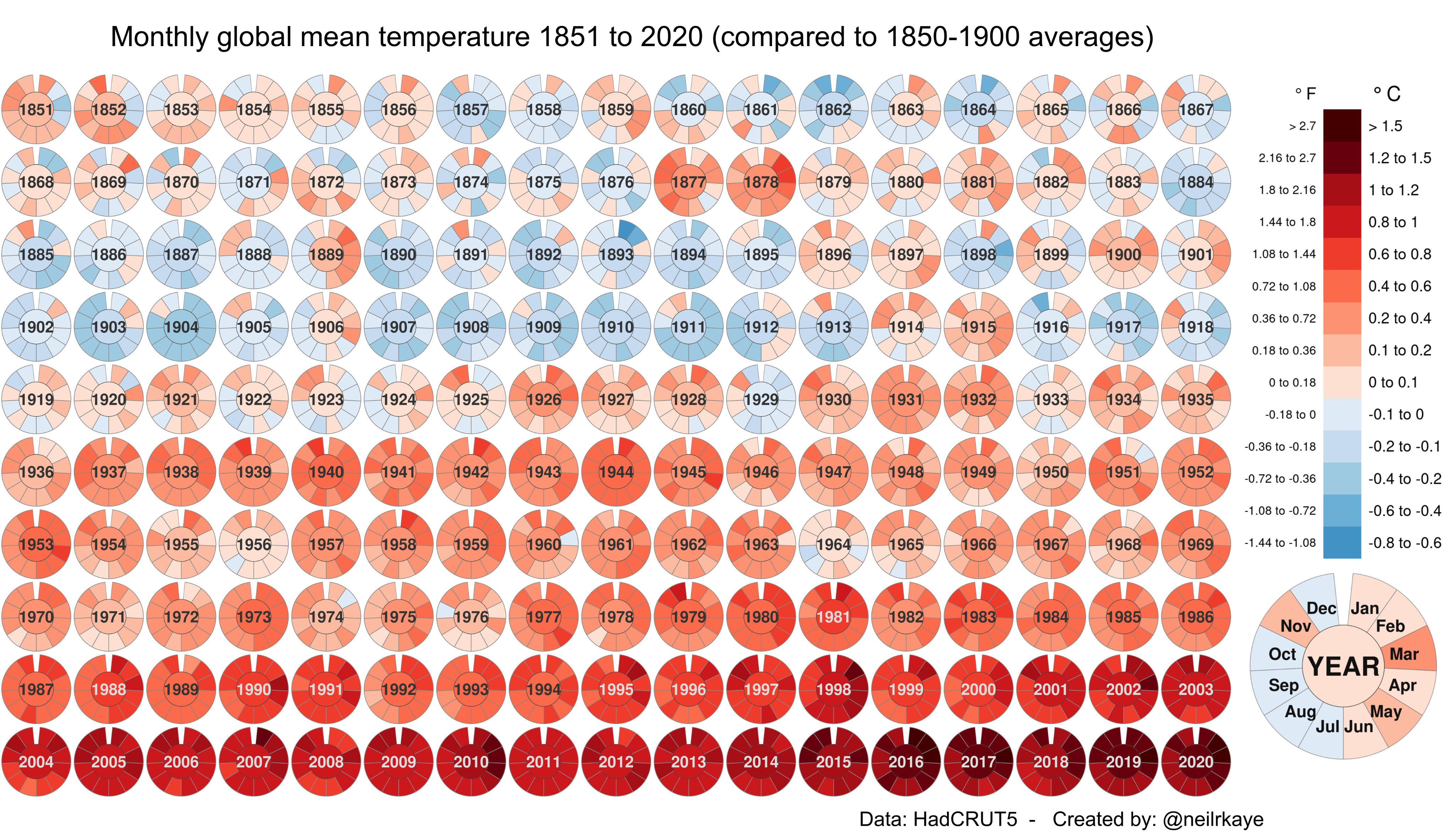 Global monthly temperature between 1851 and 2020 compared to average for 1850-1900. This uses the latest version of HadCRUT5 showing many recent months more than 1.5°C above pre-industrial values. Created by Neil Kaye.